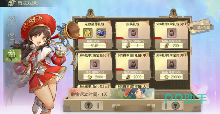 活动安排是从3月30日9:00开始,截止4月2日9:00。今年的愚人节给大家准备了大礼包,可以免费领取限定称号“愚你同乐”,并且有50%概率礼包上架,开箱体体验大提升,只要200龙券就能开。