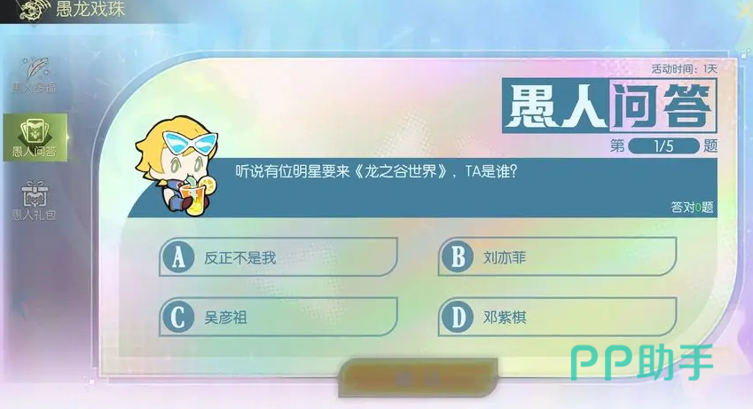此外,活动期间只要每日登录,就能直接领取50%概率1阶礼包。然后每天参与“愚人问答”,完成5道趣味问答不管是答对了还是答错了,都可以获得随机奖励。有的问题的答案会出乎意料,有点脑筋急转弯的感觉。