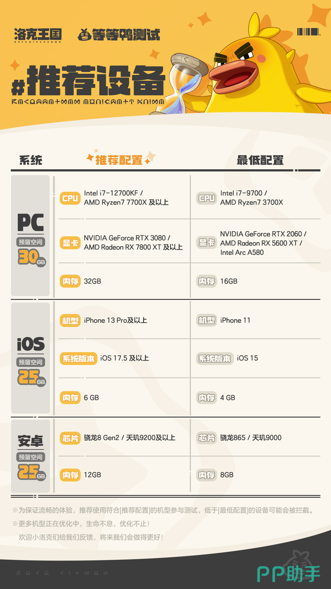 洛克王国世界这个游戏支持PC端,想要让游戏顺畅运行,就必须要保证使用的是Windows10及以上的系统,CPU需要最低Intel i7-9700 /AMD Ryzen7 3700X,还需要让设备有16gb内存,在显卡上可以选择使用NVIDIA GeForce RTX 2060 /AMD Radeon RX 5600 XT /Intel Arc A580,当然这只是最低的配置要求,还需要保证设备预留30GB的空间,另外这个游戏也支持手机端,Android需要使用骁龙865或者天机9000的芯片,iOS端则需要使用iPhone11以上的机型,保证iOS15以上的系统版本才可以。