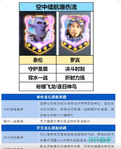 空中续航爆伤流:选择泰伦,还有罗宾。泰伦在被动状态中守护圣盾就可以带来持续性治疗的效果,并且在治疗的过程中,自身还能获得对应数额的护盾值,可以快速的提升生存能力。决斗时刻可以让罗宾尽快的使用怒气技能,并且罗宾的怒气技能就属于一个范围性伤害,可以直接造成控制伤害,有效提升攻击力。