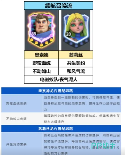 续航召唤流:英雄方面选择茜莉丝,还有奥索德。野蛮血统就可以让奥索德在血量比较低的时候获得一个怒气值。并且在每一次释放技能时,还可以有效提升生存的能力。共生契约可以在角色召唤援军的时候继承以其中一部分的属性。大幅度提升茜莉丝的攻击力,还能有效带来减伤的效果。