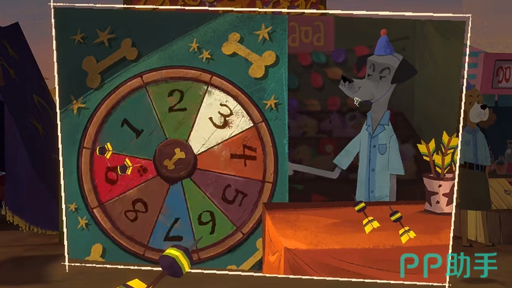 不过摊主是个“黑心商贩”,他会在你扎飞镖时动手脚。前两镖转盘的速度都正常,到第三镖时转盘会突然加速,怎么也扎不中。飞镖对准摊主,把他扎晕,转盘会停下来,这时候再扎第三镖,就能轻松过关啦!