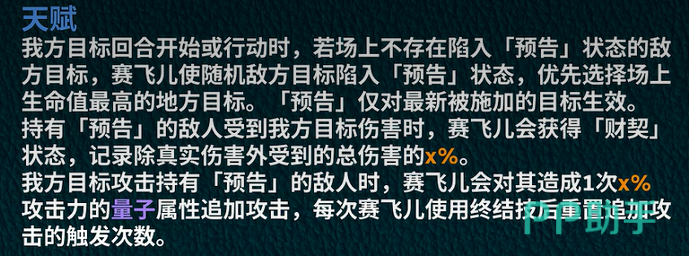 队友在攻击带有印记的敌人时,赛飞儿会根据伤害的比例触发一次基于自身攻击力的追加攻击。这里有个小亮点:这次追加攻击是全队共享的,也就是说,即便你的队伍里有多个输出,赛飞儿的追加攻击只会在每次大招释放周期内触发一次。这一点需要合理搭配队友的技能释放时机,才能最大化其输出效果。