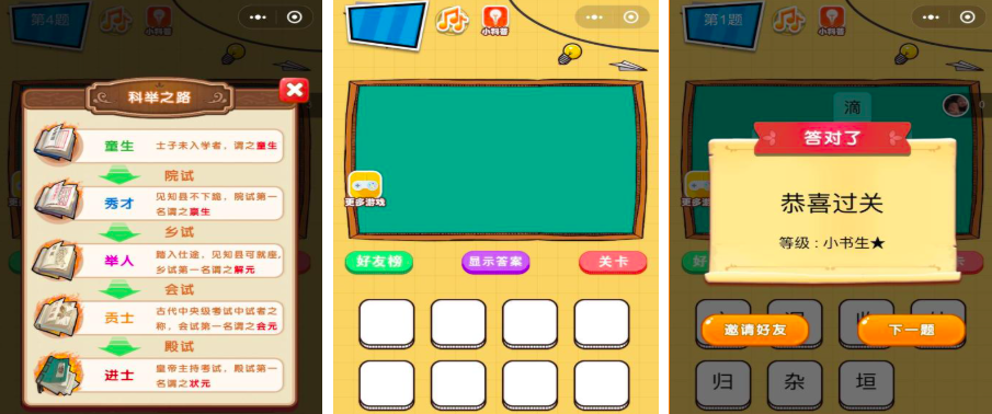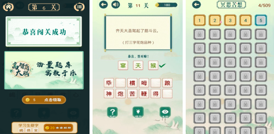 才子猜字谜,也是非常不错的一款游戏,在画面设计上更加趋向于简约风,玩家不仅可以接触到很多经典的谜面,并且还可以邀请好友,互相出题,体验更多互动乐趣。目前该游戏作品打造了100个关卡内容,两种辅助道具,能够帮助玩家高效通关,每次成功通关,都有丰富的金币奖励哦。