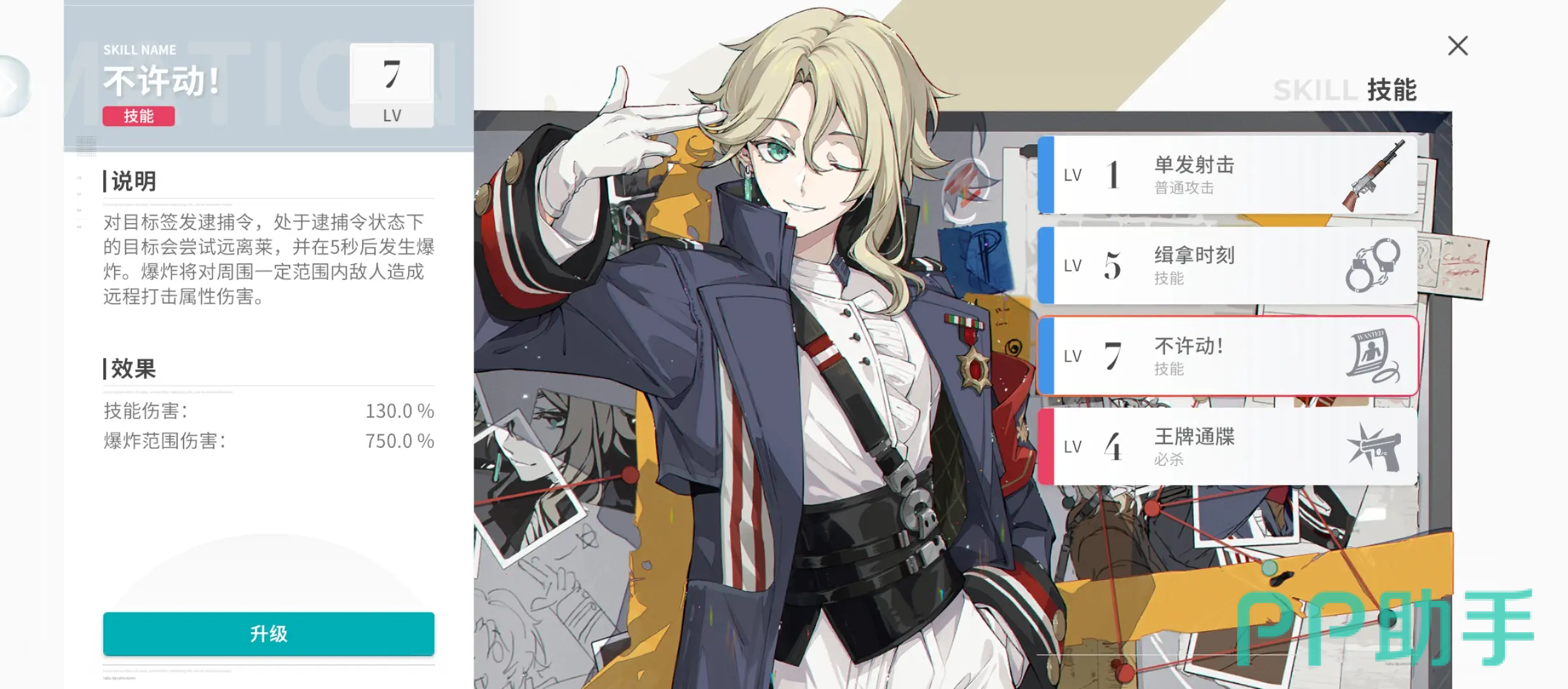 1技能”不许动”,对敌方目标发布“逮捕令”,处于逮捕令状态下的对手会尝试远离该角色,但是在5秒之后会发生爆炸,爆炸会对周围一定范围之内的敌方单位均造成远程打击属性损伤。