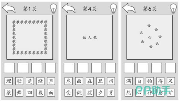 相比传统的看图猜成语游戏,这款游戏内的图片内容,也是由汉字组成的,例如很多个歌字组成一个正方形,大家是否会联想到四面楚歌呢。《看字猜成语》就是以这样独特的汉字图片,和两行汉字提示,令大家展开成语的猜谜。简单纯粹的黑白灰配色,令大家可以拥有舒适轻松的游戏氛围,丰富关卡中还有一键提示内容,供大家在没有头绪的的时候过去提示。