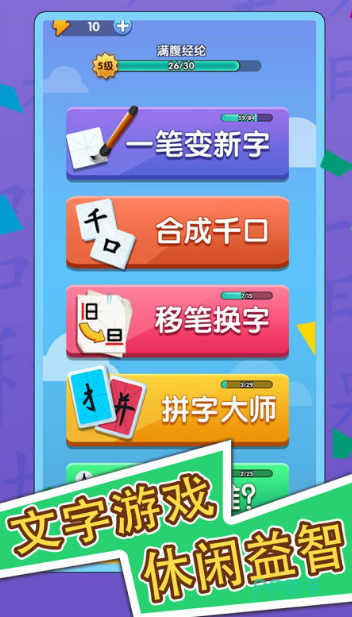 这款丰富多变的汉字和文化手游,不仅融合当前网络丰富热门话题,还结合历史典故和成语等元素,打造了让玩家动心的汉字游戏。游戏包括汉字的解谜和识别错字等丰富玩法,使用汉字拆解和组合等方式对谜底进行挑战,极其丰富的错别字关卡让玩家的挑战一重又一重。部分难度较大汉字关卡采用了时间限制模式,对于玩家的反应能力和汉字识别能力是一个考验。