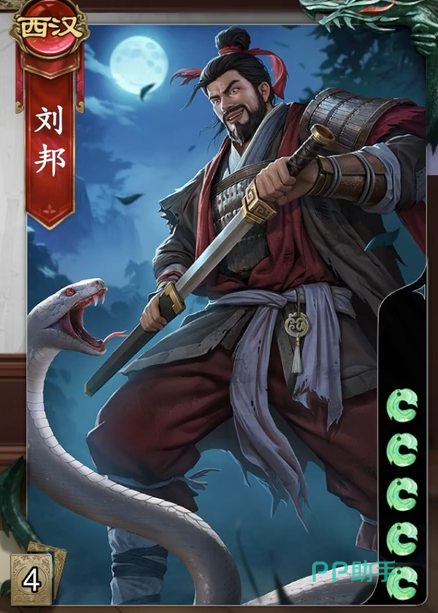 这位是西汉的角色,也是主公阵营可以选择的武将之一。这位的初始体力有5点,算得上是中规中矩的体力值。刘邦本身的1技能是斩蛇起义。这个技能是刘邦的限定技能,选择1张除了杀以外的手牌,之后可以销毁游戏里面的所有同名牌。接下来本局游戏里面每次弃牌都可以让另一位角色摸两张牌。这个技能很强,用得好可以左右游戏的胜局。第二个技能是大风歌,一个回合限定1次,如果摸到点数5的牌可以将其弃置,然后重新洗牌,随机弃置各角色一张牌,然后可以让一名角色摸到手牌上限。