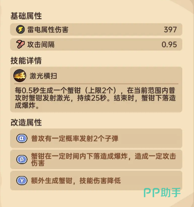 该武器的技能 “激光横扫” 是一大亮点,可以每0.5秒生成一个蟹钳,上限是2个。玩家在有效攻击范围内普攻时,蟹钳可以发射持续25秒的激光伤害。该特点适合应对PVE场景,在挑战世界BOSS的时候,激光持续输出能稳定给BOSS叠加雷伤,有效消耗血量。在技能结束时蟹钳会下落爆炸,伤害能对BOSS造成小爆发,在残血时直接带走。