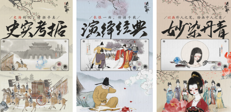 在画境长恨歌游戏中玩家会面对一幅幅带有故事情节的水墨画,改画环节是其重要玩法,设有“生”“情”“灭”三种墨色,分别对应蓝、红、黑,玩家需结合画面内容与对应诗句给出的线索,选择合适墨色对画境进行操作,根据诗句描述玩家要在指定位置创作特定景象,只需简单勾勒出大致形状。这种玩法给予玩家创作的乐趣,降低了绘画门槛。