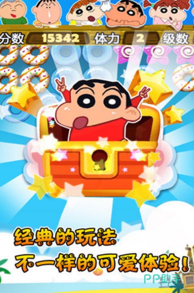 各位将在游戏里与蜡笔小新一同进入泡泡龙世界,利用自己的射击技术来将关卡里的泡泡全部打下来。这部游戏设计了将近一百道不同形式的关卡,里面的机制也相当丰富,在难度上也会随着玩家闯关的进度而增加,可谓越玩越有挑战乐趣。而且蜡笔小新还经常会在游戏里给玩家赠送宝箱,打开后还能拿到众多很好用的趣味道具。