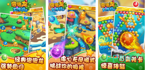 足够经典的特色游戏,带着玩家回味儿时欢乐时光,设置了较多特色的泡泡消除玩法,通过泡泡射击指定位置,将三个或者三个以上相同颜色泡泡消除即可。全新设计的经典模式与剧情模式将在不同的模式下挑战高分不断闯关。游戏中的泡泡消除元素效果相当真实,给玩家带来完美体验与感受。