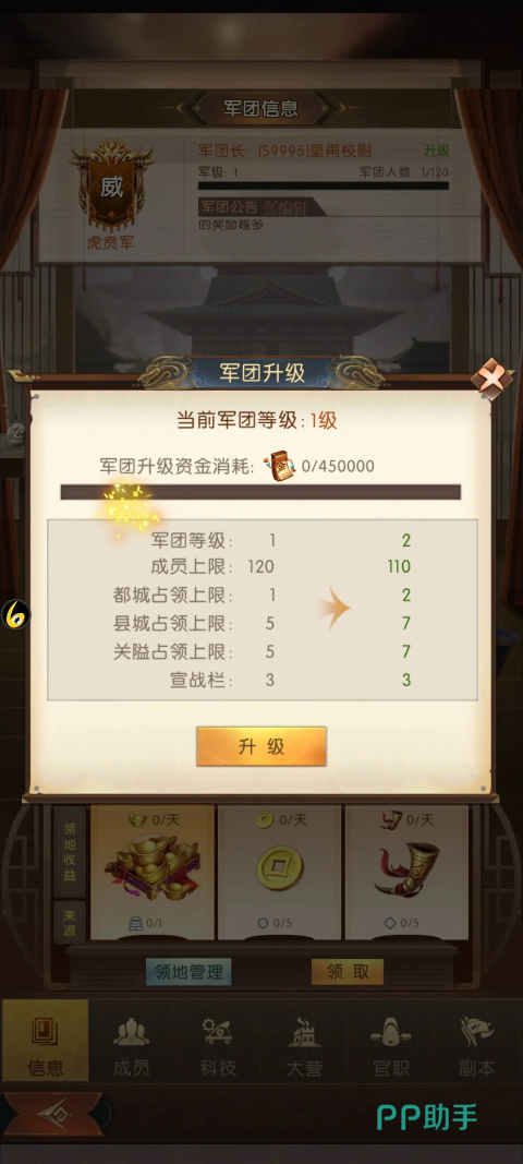 三国问鼎山河军团是什么?作为游戏中玩家协作与势力扩张的核心载体,军团系统是玩家从孤城崛起为一方霸主的必经之路。玩家需解锁27座城池后创建或加入军团,通过集体攻占地图板块、完成日常任务获取资源,提升军团等级以解锁更多城池占领权。每个板块结算时,成员可共享元宝奖励,等级越高的军团能占据更多战略要地,形成资源与实力的良性循环。