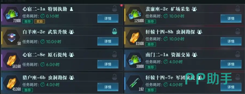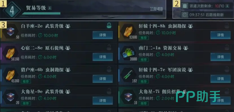 在基地建造了“贸易中心”后就可以解锁这个功能,从日常挑战找到星际贸易页面,左上角是当前贸易等级和经验,右上是派遣的次数和任务刷新还需要的时间,而整个界面的下方则是各种任务、奖励、以及耗时。