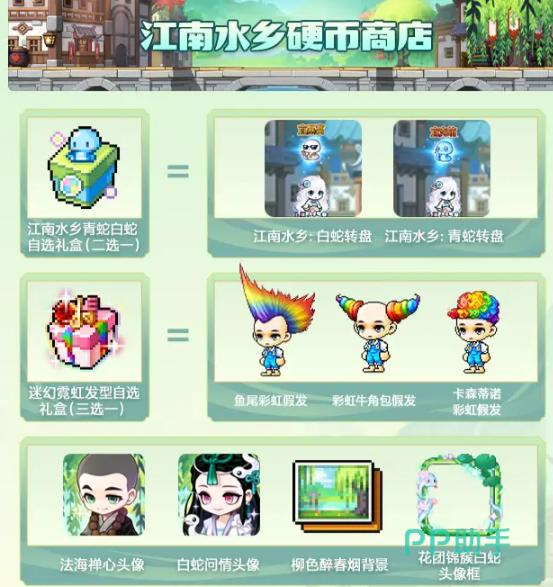 其中商店的最大奖便是江南水乡青蛇白蛇的自选礼盒。咱们可以从这个礼盒里面选择白蛇转盘或者青蛇转盘。除了这个礼盒外还有着迷幻霓虹发型自选礼盒三选一。三个发型都是各有特点,玩家们可以选择自己喜欢的来进行兑换。