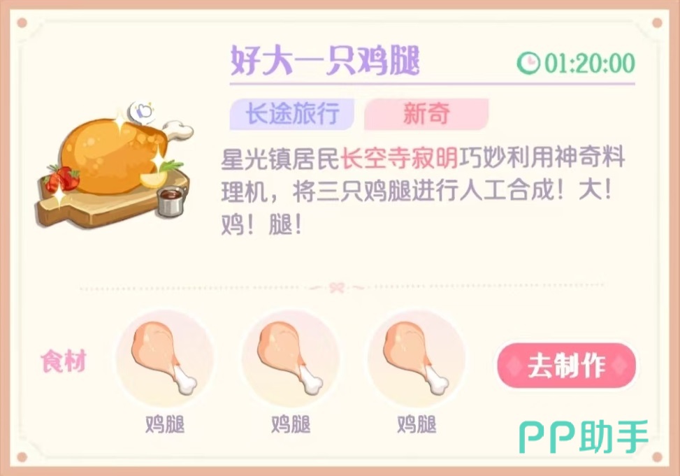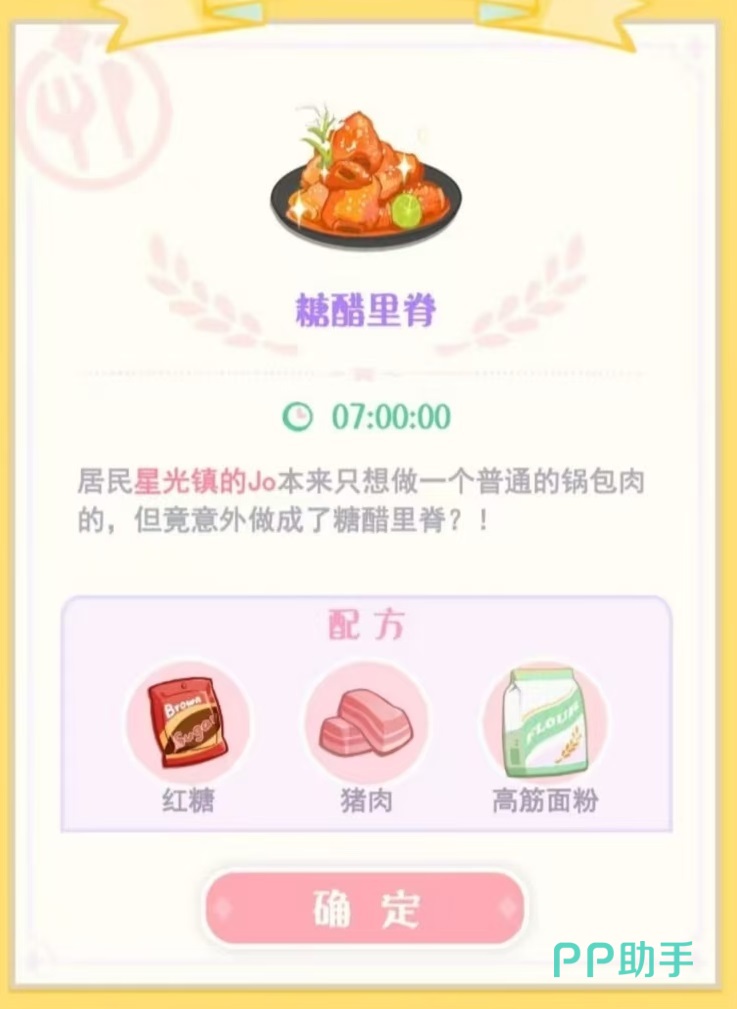 第5个土耳其软糖,这是在尝试用草莓酱和面粉做出草莓酱面包时,意外做出了神奇的草莓酱软糖,配方是红糖、草莓酱和中筋面粉。第6个落水包,采用的配方是糯米团,白菜和猪肉。第7个锅包肉,制作普通炸猪排时,意外获取到的美食,配方是红糖、猪肉和高筋面粉。第8个是四果汤,经过改良后的水果糖水配方需要矿泉水草莓和糯米团制作出来。第9个糖醋里脊,本来只想做普通锅包肉,意外成为了糖醋里脊,需要红糖、猪肉和高筋面粉。第10个好大一只鸡腿,将三只鸡腿进行人工合成得到的超大鸡腿,配方就是三根鸡腿。