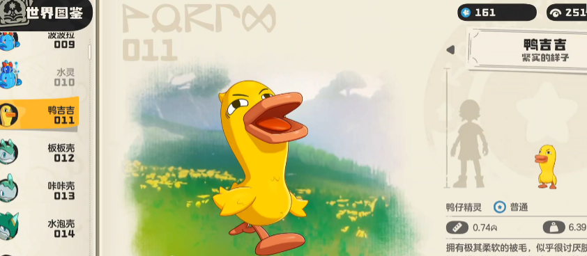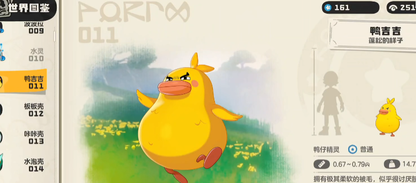 鸭吉吉是游戏中一只不会进化的宠物,也就是说它只有一种形态,身体上的毛极其的柔软,整体形态憨态可掬,喜欢会闪光的物体,对新奇事物也比较感兴趣,很聪明的宠物。