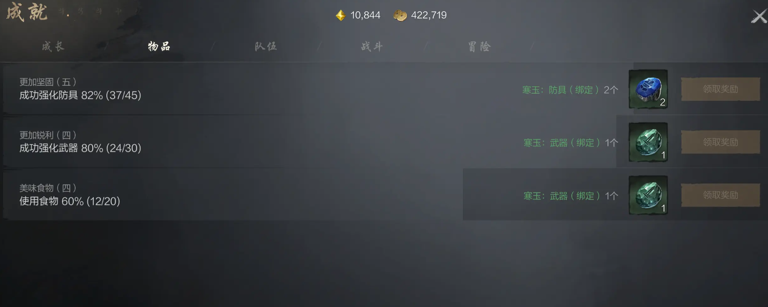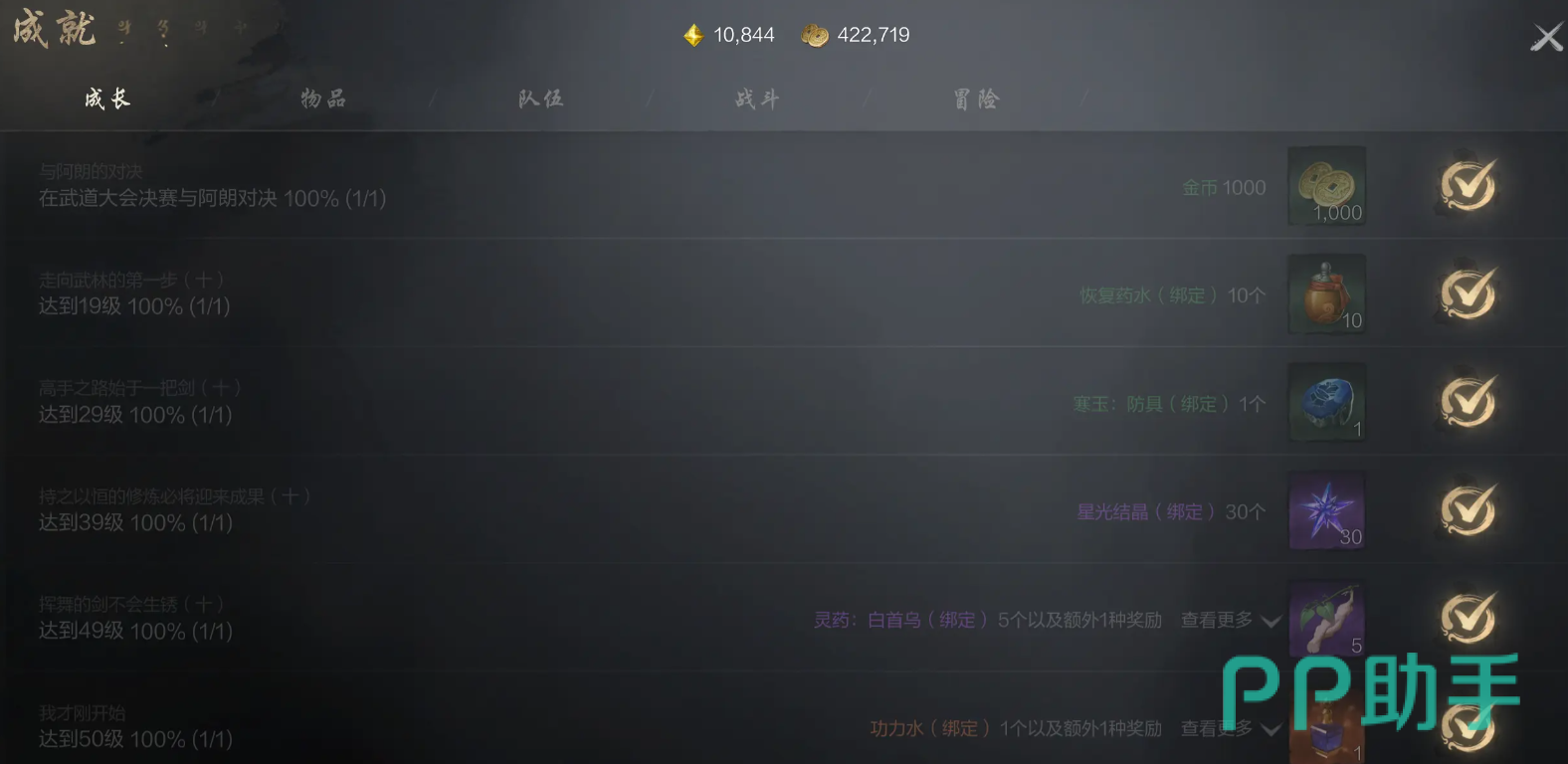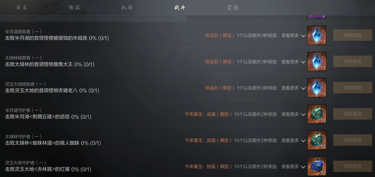 战斗板块的成就有至尊强化材料,完成方式为根据提示找到特定怪物击杀,队伍通过提供星光结晶,能用来体验命运星图,成长会提供数量有限的功力水,物品的成就提供的就是道具奖励。