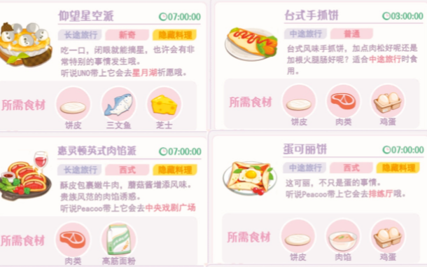 有关三文鱼的料理中,有两道菜是烹饪耗时非常长的料理,这两个都是隐藏料理,而且都是比较新奇的食物种类,适合在长途旅行的时候食用,一个需要饼皮,三文鱼和芝士,可以制作成仰望星空派,带上这个食材之后可以去星月湖祈愿,另外一个就是鱼跃龙门贝果,这个需要的食材非常简单,只要三文鱼和贝果就可以,因为是隐藏料理,玩家可以带上他去海边,吃掉这个食物有可能会发生一些比较神奇的事情,因为是隐藏料理,食物的烹饪时长是非常长的,需要耗时7个小时才能制作完成。