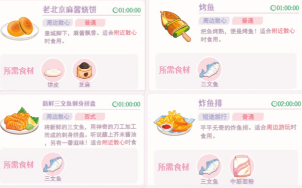 首先在游戏里可以用三文鱼制作烤鱼,这是一个非常普通的料理食材只需要耗时一个小时就可以,需要的材料也非常简单,只需要三文鱼这一种,把鱼烤熟之后就烹饪完成了,非常适合角色在散心的时候食用,另外还可以做成新鲜的三文刺身拼盘,这个食材也只需要三文鱼这一种,制作时间比较短大家,也非常适合在散心的时候食用。