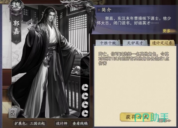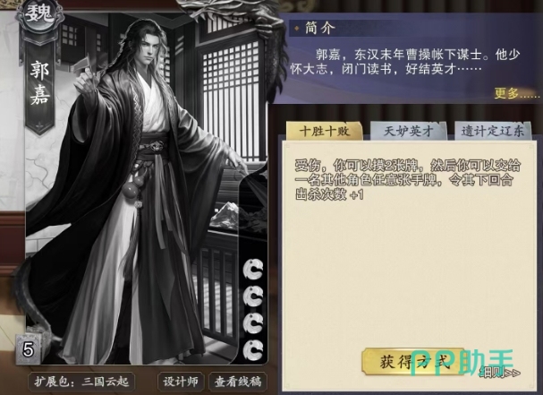 在游戏中郭嘉被设计为一张初始血量仅有4滴的卡牌,但这并不意味着他易于对付,相反他拥有三个强大的技能,首先是十胜十败,这个技能的触发条件是郭嘉受到伤害后,一旦触发他便可以摸取2张牌,摸到的这两张牌之后郭嘉可以根据自己的战略意图,灵活地交给场上任意一名其他角色,而且这个交出手牌的过程并非只能局限于通过受伤摸到的那两张牌,郭嘉完全可以自主选择交出任意数量的手牌。