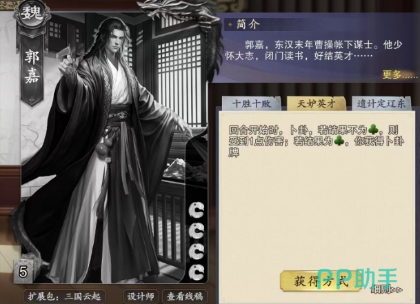 这里所说的卜卦,具体操作是翻开牌堆顶的那1张牌,它的属性或者点数都将被仔细审视,并根据其对应的规则执行相应效果,可能会为郭嘉带来意想不到的优势与转机,值得注意的是,在整个游戏过程中,只有当天妒英才技能触发的卜卦结果为木属性时,郭嘉才能够成功获得那珍贵的卜卦牌,在其他所有的卜卦结算情境中,即便也会有卜卦牌的出现,但郭嘉却无法将其收入囊中。