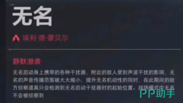 无名是在游戏里全新上线的一个干员,会在4月17日加入战场,在游戏里是一个带有反侦查能力的突击干员,不只有非常优秀的大招,并且在对战的时候还可以躲避敌人的侦察,是一个单体战斗能力非常优秀的角色,之所以要设计这个角色是为了填补团队中单兵角色的空白,能借助这个角色较高的机动性提升整个队伍的能力。