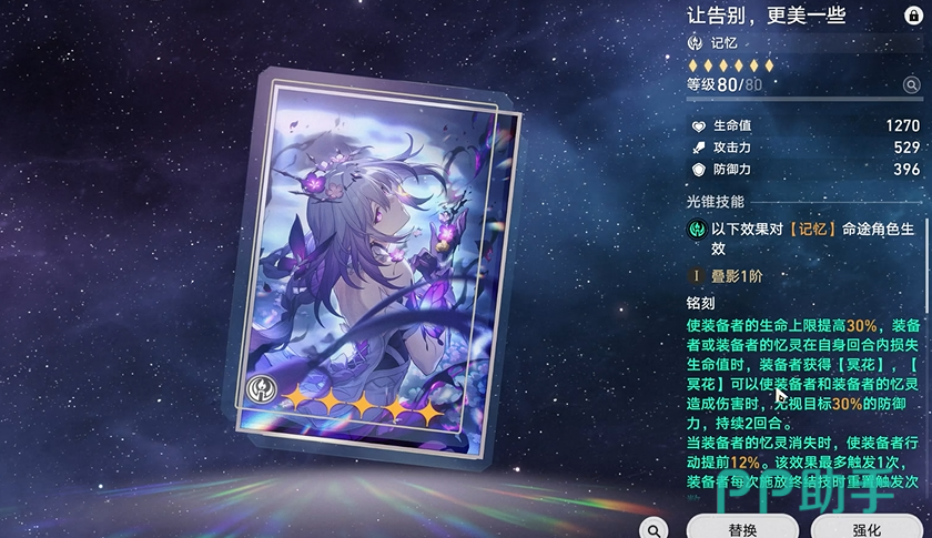 专属光锥“让告别,更美一些”是遐蝶的专属光锥能力,使用后可以使装备者的生命上限提高,这对于以生命值为重要输出属性的遐蝶来说,直接提升了角色的基础输出伤害,装备者的忆灵可以在对战时通过损失一定生命力,对目标进行无视防御的输出,这一特殊效果可以在遐蝶烧血输出的过程中,有效提升死龙的伤害,让输出更加高效,同时光锥还有一定的拉条效果,在忆灵消失时可使装备者行动提前,加快遐蝶的行动节奏,增加输出频率。