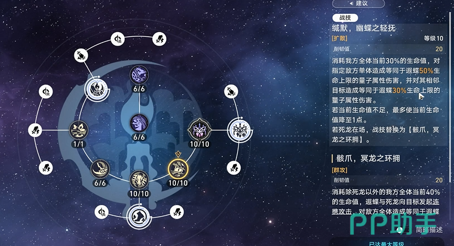 普攻蝶舞穿刺可以对指定敌方单体造成伤害,也是她基础的输出手段,虽然伤害数值相对战技和终结技不高,但在前期过渡以及积攒能量等方面有一定作用,战技技能幽蝶之轻抚使用后,会消耗己方全体一定数量的生命值,对敌人造成一定的量子伤害,也可以对敌人的相邻目标造成同等伤害。