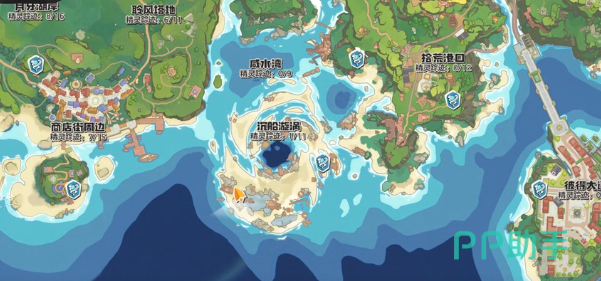 玩家来到地图的下方,马上就能看到有一个沉船漩涡。通过传送点就可以迅速的来到红圈位置,这里就有一个副本。进入到副本之后,可以通过传送门让水位逐渐的上涨。接着来到三个传送门的附近,然后通过中间的传送门进去。