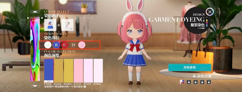 染色是分部位进行的,选择好了染色剂之后,区分部位展开染色,在选择的位置,可以看到对应染色的部位的,点一下会有亮点提示,区分为“A/B/C/D/E”几个不同的部位,点击对应的图标,就能看到人物染色的是哪个部分了,主要是针对服装的五个部位展开染色。