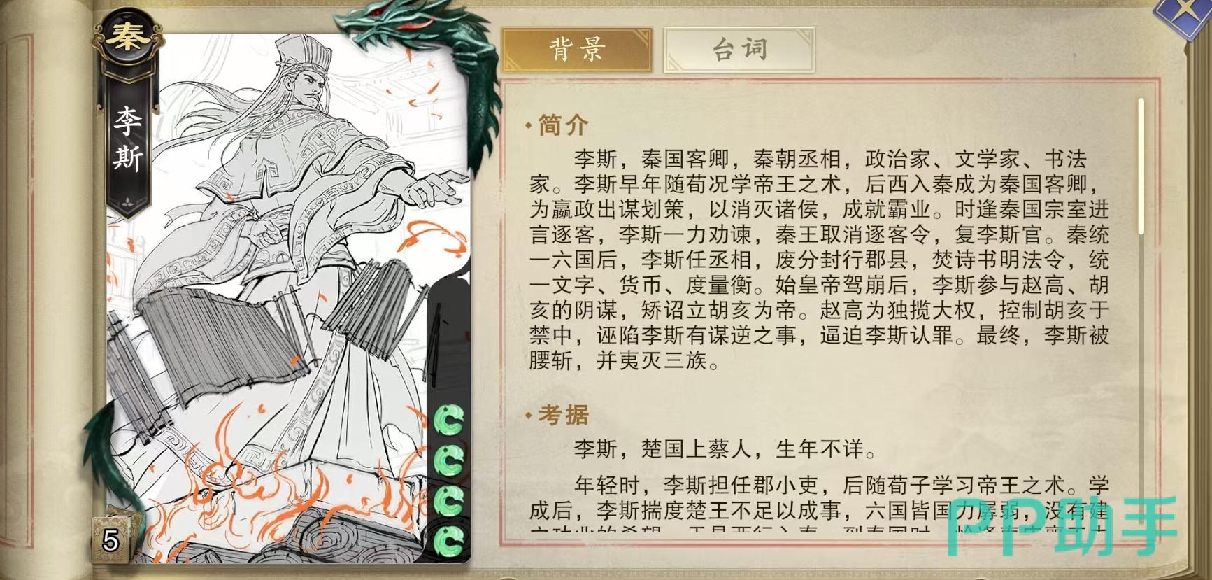 在历史中,李斯是非常著名的谋士,相信大家对这个人物也都有着很深刻的认识,在代号杀这款游戏中也将李斯重新制作出来,并赋予了诸多强势的技能,小编今天来讲一下代号杀李斯怎么玩。因为这是刚刚推出的人物,所以还有很多小伙伴们了解的不多,不清楚它的技能效果具体如何以及如何去应用,一起往下看吧。