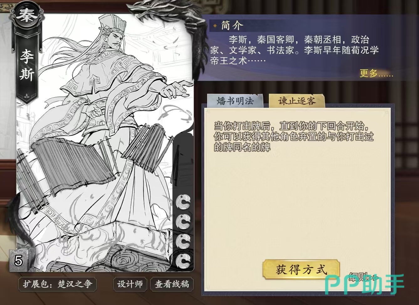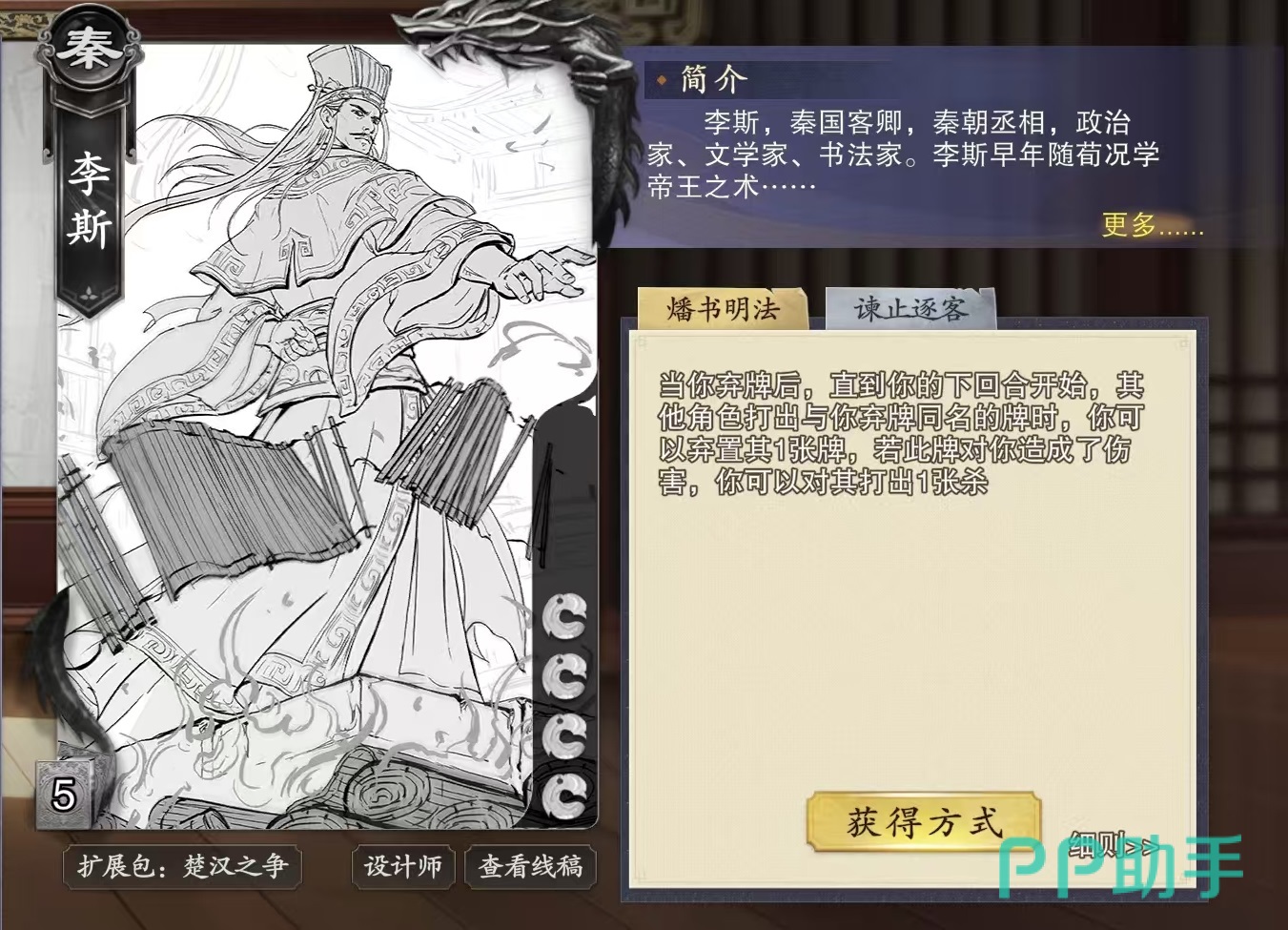 李斯在初始体力方面一共有4点,它主要有两个技能,分别是燔书明法和谏止逐客,这两个技能也都和李斯在历史中的事迹相关。第1个燔书明法,当李斯弃牌后,直到下一回合开始,其他角色打出与李斯弃牌同名的牌时,就可以弃置其一张牌。如果此牌对李斯造成了伤害,那么可以对其打出一张杀。谏止逐客的效果是当李斯打出牌后,直到下个回合开始,可以获得其他角色弃置的与打出过的牌同名的牌。