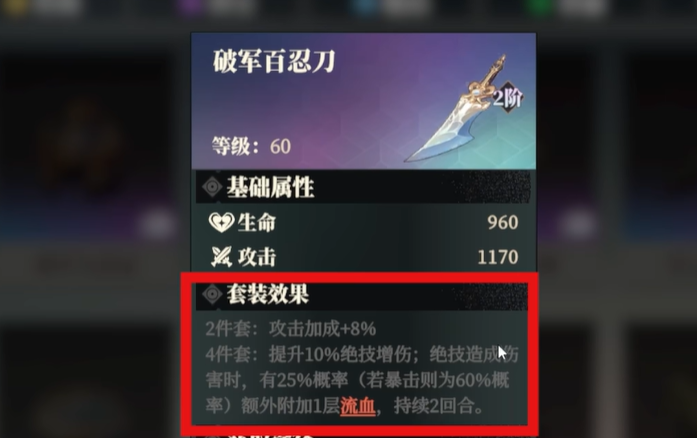 那么曹操的定位一看就是个主c角色,所以武器方面选择破军,破军的基础属性不错,而且被动能力可以提供攻击力以及绝技的额外属性,并附加流血效果,使得曹操在大招形态下能打出更加恐怖的伤害。