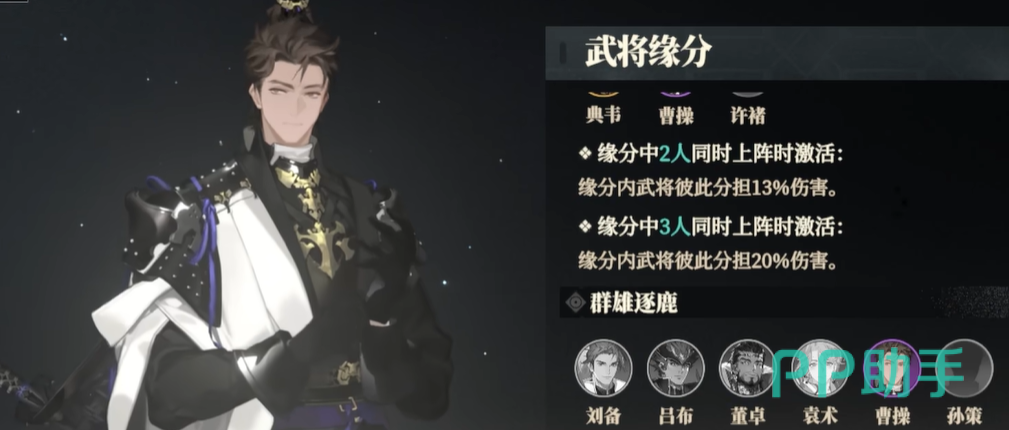 接着就是突破和武将缘分,突破的话就需要消耗财力去抽曹操的卡牌,这个不太推荐平民使用,另一个就是武将缘分,选择一个角色跟曹操建立联系可以获得共享效果,推进群雄逐鹿的角色,这类角色可以提供攻击和免伤属性,刚好增强曹操的全面性。