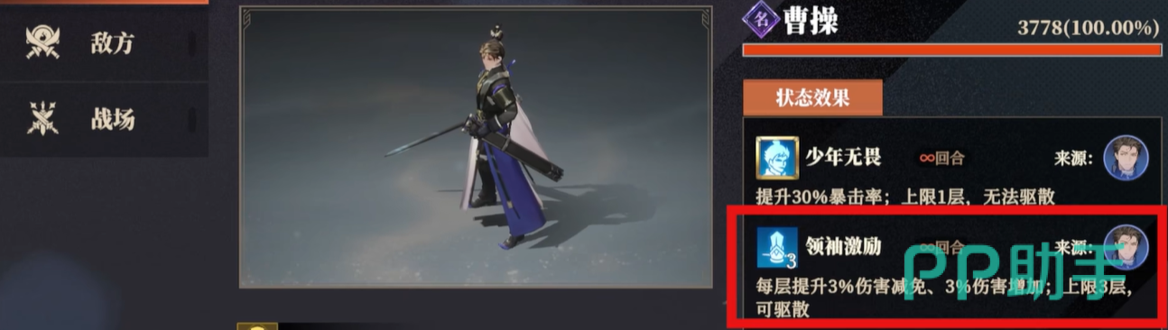 先看看曹操的技能,通用技能有两个,一个可以增强自身的破甲效果,可以随着回合的增强进行叠加,另一个是驱散效果,可以驱散我方的负面效果,属于可以进攻也可以辅助,这很符合领袖的设定,可以在很多的阵容进行就业。
