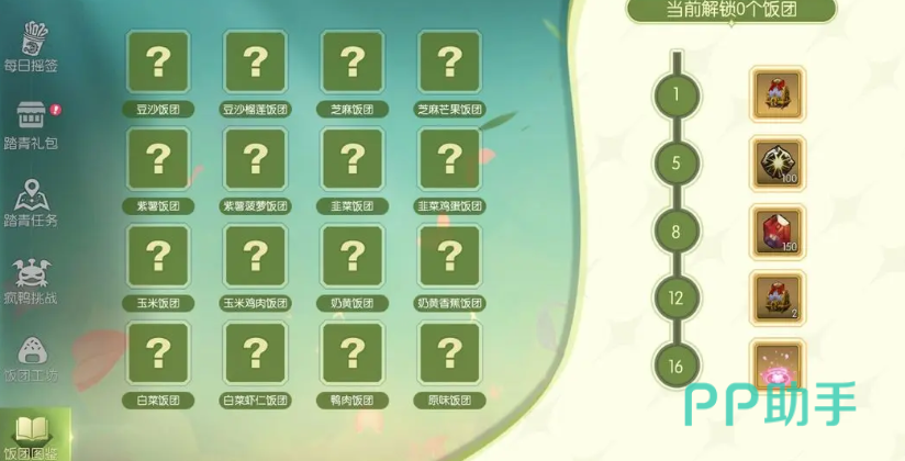 饭团总共有16种,每成功解锁出一种新的,就能获得图鉴奖励,解锁达到了指定数量,还能获取额外资源,大家可以尽情尝试不同配方,拿到隐藏饭团,解锁全部的图鉴。
