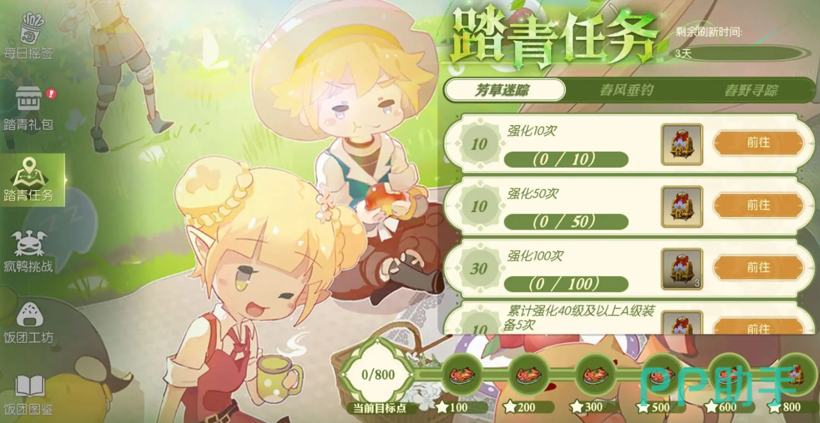 “踏青任务”,也就是活动期间的活跃任务,每天都有全新的,任务内容也都很简单可以轻松完成,跟着指示去做就能拿到饭团材料加资源奖励,“疯鸭挑战”是活动特别副本,每天可以挑战两次,通过在其中获取分数,累积分数达到一定目标能拿到对应奖励。