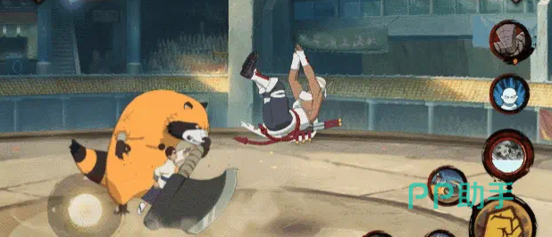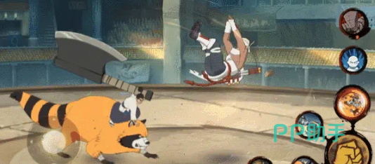 阿三有一个特殊机制,那就是开局和一只叫胖太的浣熊一起出战,属于骑乘状态,使用一技能可以切换为站立状态,两种状态下普攻和技能都会有所不同,他的普攻在骑乘下总共会打七下,第二下比较特殊能击飞,站立则是4下,其中3A会抓住敌人重摔,4A是将敌人重砸向地面。