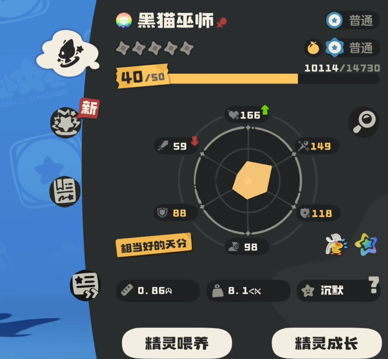这个精灵的初始种族值比一般的要高。其中尤其是魔攻这个数值竟然高达115。这个在未进化的精灵之中是十分少见的。其余的除了物攻和生命比较少以外,小黑猫这个精灵基本上没有其他的问题。