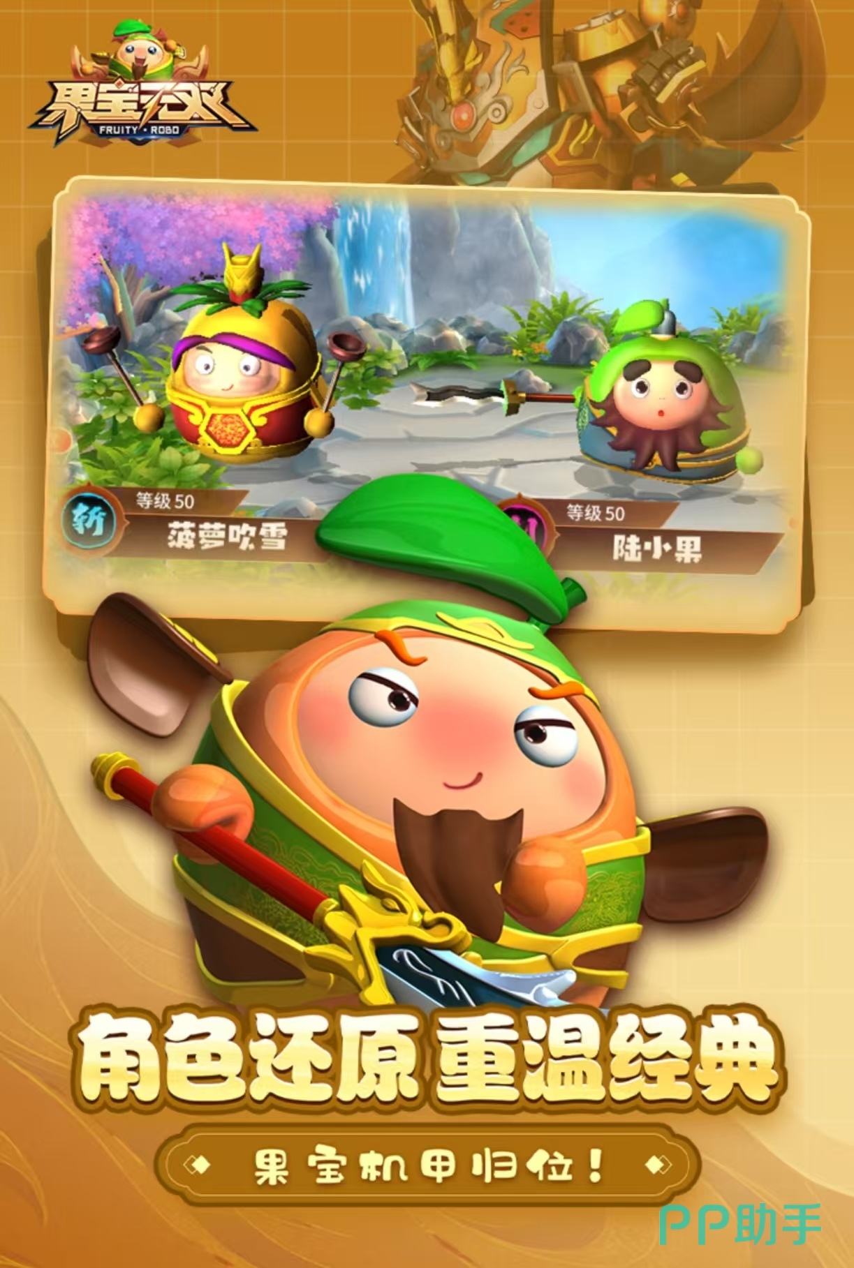 《果宝无双》经典的原班人物在游戏中都会出现,每一个机甲的设计都有个人特色,玩家将收集这些角色组建一支国宝战队。不同的组合会有不同的作战效果,作战时可以随机的切换机甲,不断的升级来提高他们的能力。可以通过完成副本掉落的碎片来获得武器,到达25级之后可以拥有公会系统,商店里面也会售卖碎片和机甲部件。