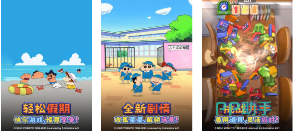 本作是款极其受欢迎的日漫卡通风格休闲益智作品,游戏呈现精美日漫UI跟细腻呈现的角色,经典的蜡笔小新剧情和地图设定都是亮点,你将以蜡笔小新的身份挑战不同角色获取资源,甚至可以在家里做家务或者与NPC互动,超级高的互动性和萌系的视觉效果都令人着迷,化身蜡笔小新感受游戏时光的感觉也很温馨。