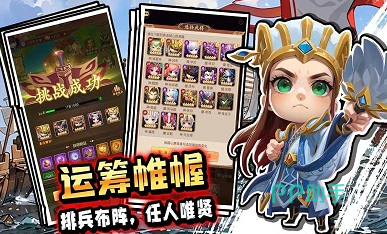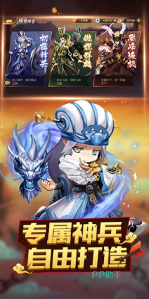 这是一款轻松愉悦的休闲策略卡牌手游。这款游戏精心设计了多重玩法:日常模式中,玩家可以体验闯关斩将、武将试炼、神器探索、魂玉搜集等,轻松获取丰富的武将、神器及装备资源,采用了可爱的Q版画风,搭配趣味横生的剧情设计,以及华丽炫目的技能特效。在这里,玩家可以自由组合各种技能与营地策略,只要玩家的创意无限,就能发挥出令人惊喜的战斗效果。
