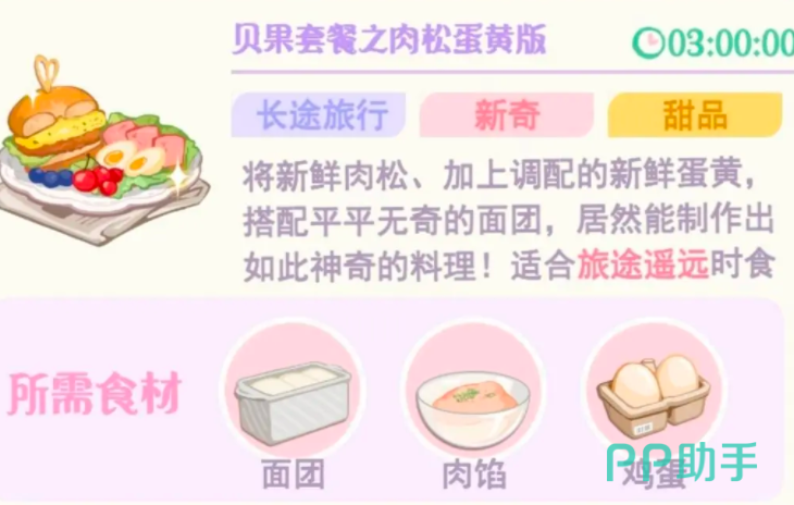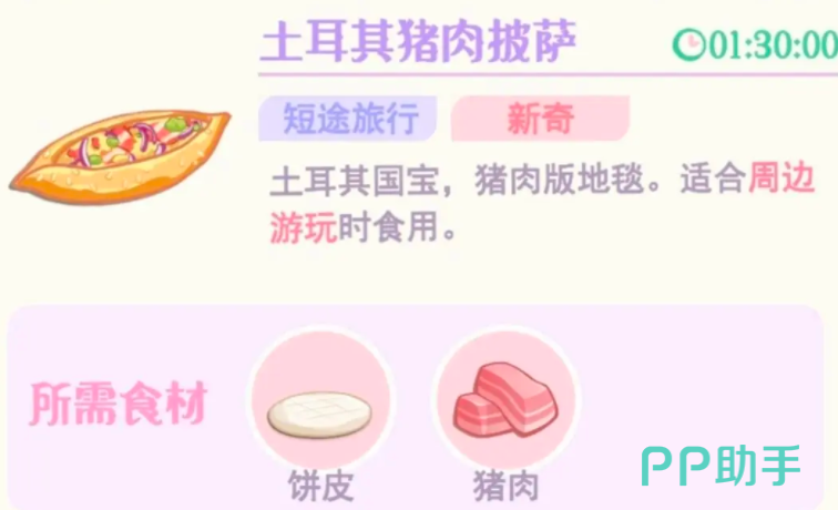 这个角色除了喜欢这种常规的素食之外,还对于各种新奇的菜品很感兴趣,在周边旅行的时候,角色会选择饼皮和猪肉制作的土耳其猪肉披萨,这个披萨的外观比较独特,像一个硕大的开,这个角色会选择芝士培根三角包,还会选择贝果套餐之肉松蛋黄版,两个都是比较新奇的菜品,玩家需要准备面包,培根芝士,另外还有面团,肉馅,鸡蛋,这样通过组合就能制作出这两道菜品。