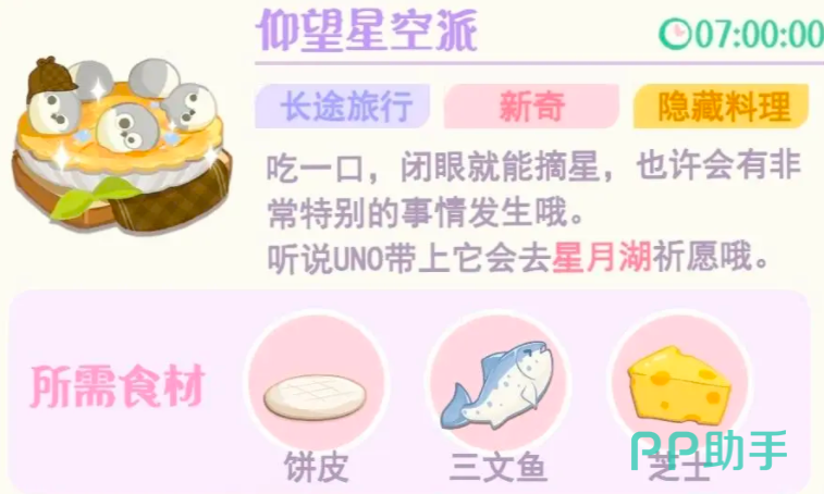 除了常规的菜品之外,这个角色还比较喜欢仰望星空派,需要饼皮,芝士三文鱼进行搭配,是一个造型非常奇特的食材。