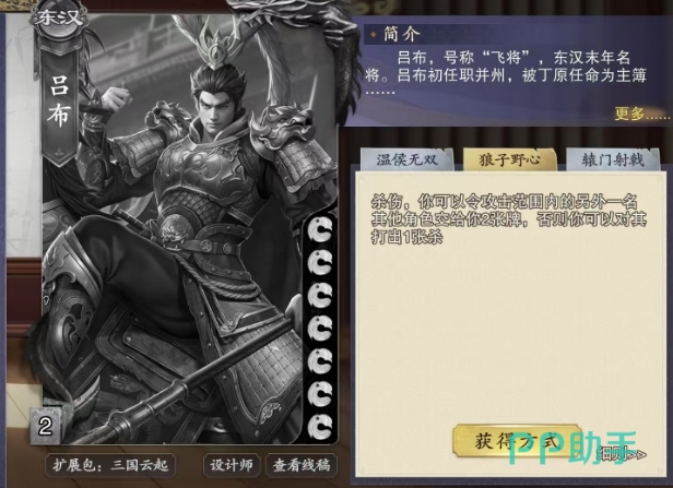 另外还有狼子野心这个技能也是他的核心能力之一,当持有该技能的角色发动它时,能够针对攻击范围内的另一名其他角色产生独特的效果,此时这个角色有两种方式可供选择,一种是主动交出2张牌给技能持有者,另一种则是,如果对方拒绝交出牌或者无法交出足够的牌,那么技能持有者便可以对其打出1张杀牌。