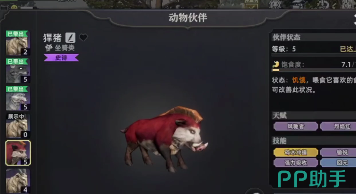 野猪在游戏当中也是非常重要的一个采集宠物,它具备有技能碎木冲撞,可以帮助玩家极大程度地收集木材,如果玩家想要捕猎它,必须前往到森林区域当中,通过麻醉箭射击的方式,来直接捕捉。