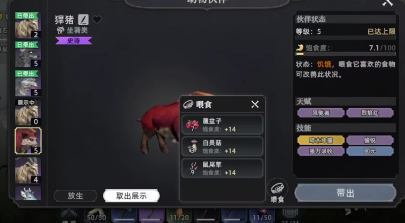 在游戏之中,如果玩家想要使用动物作为自己的采集伙伴,必须要及时喂食食物,其中包含有覆盆子,白灵菇等等草料。