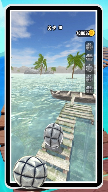 将视觉轻盈与操作紧张巧妙结合,构建出一种悬浮于云端之上的速度美学。球体在狭窄高空轨道上前行,路径由细长的平衡木、断裂的折线和突如其来的倾斜面组成,每一次转弯都像是在边缘试探。背景以云层、岛屿和天空渐变为主,色彩过渡柔和,形成强烈的空间对比,使玩家在操作中感受到高度压迫与视觉漂浮的双重刺激。