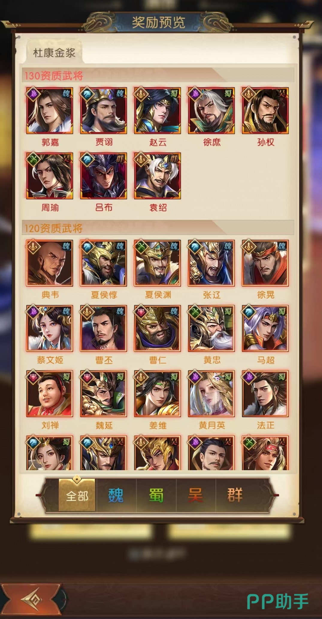 在游戏主页面中点击酒馆,就可以进入到抽卡功能。然后通过武将预览,可以直接看到卡池中可以抽取到哪些武将,其中所有的120资质武将和100资质武将都可以通过抽卡的方式获得。但是130资质的红卡武将,只有郭嘉,贾诩,赵云,徐庶,孙权,周瑜,吕布和袁绍这几个可以通过抽卡的方式获得。其他的一些顶级武将,大多数都是通过限时活动才能得到,所以通过抽卡也只能满足基本阵容搭配要求。